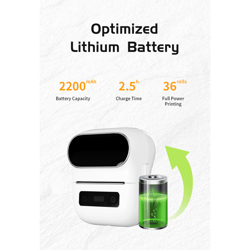 - 5V/2A 2200mAh rafhlaða sem þýðir að þú getur unnið með prentarann allan daginn. Tekur ca. 2,5klst. að endurhlaða.