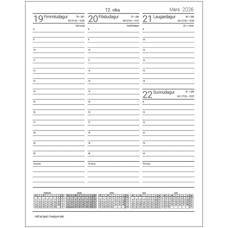 Súla dagbók í stærð A4 með teygju. Vika og minnisatriði á síðu. Viku- og daganúmer ásamt málsháttum. Ársdagatal 2025 – 2026 og yfirlit yfir frídaga starfsmanna. Ársyfirlit 2026 og yfirlit yfir tungl og sjávarföll.