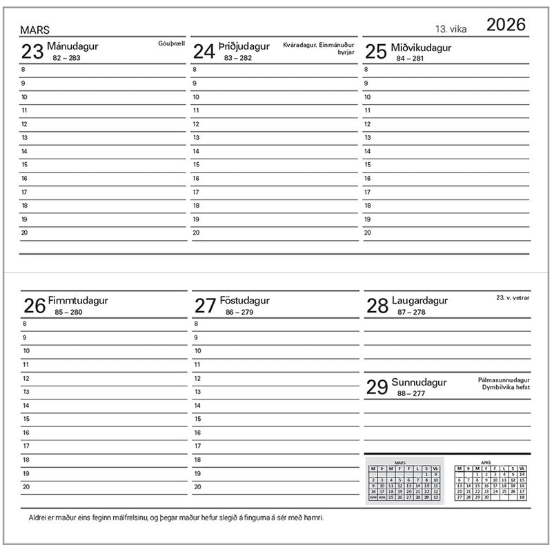 Þröstur harðspjalda vasadagbók. Vika á opnu, viku-og daganúmer. Málshættir og lands- og svæðisnúmer. Ársdagatal 2026-2027. Yfirlit yfir tungl, sjávarföll, vegalengdir o.fl.