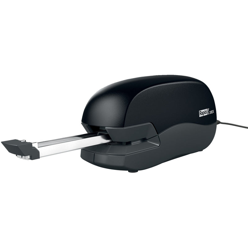 Compact electric stapler for desktop, reception desk or home use. Mains powered via electric adaptor (included), with easy one hand operation. Opens from the front for easy reloading. - Staples up to 20 sheets of paper (80 gsm) - Convenient one-hand desktop use - Operated with power adaptor (included) - For 24/6 and 26/6 Rapid Standard staples - 10 mm insertion depth - 2 year guarantee when using Rapid staplesHeftari, 20EX , rafmagns, 20 blaða svartur