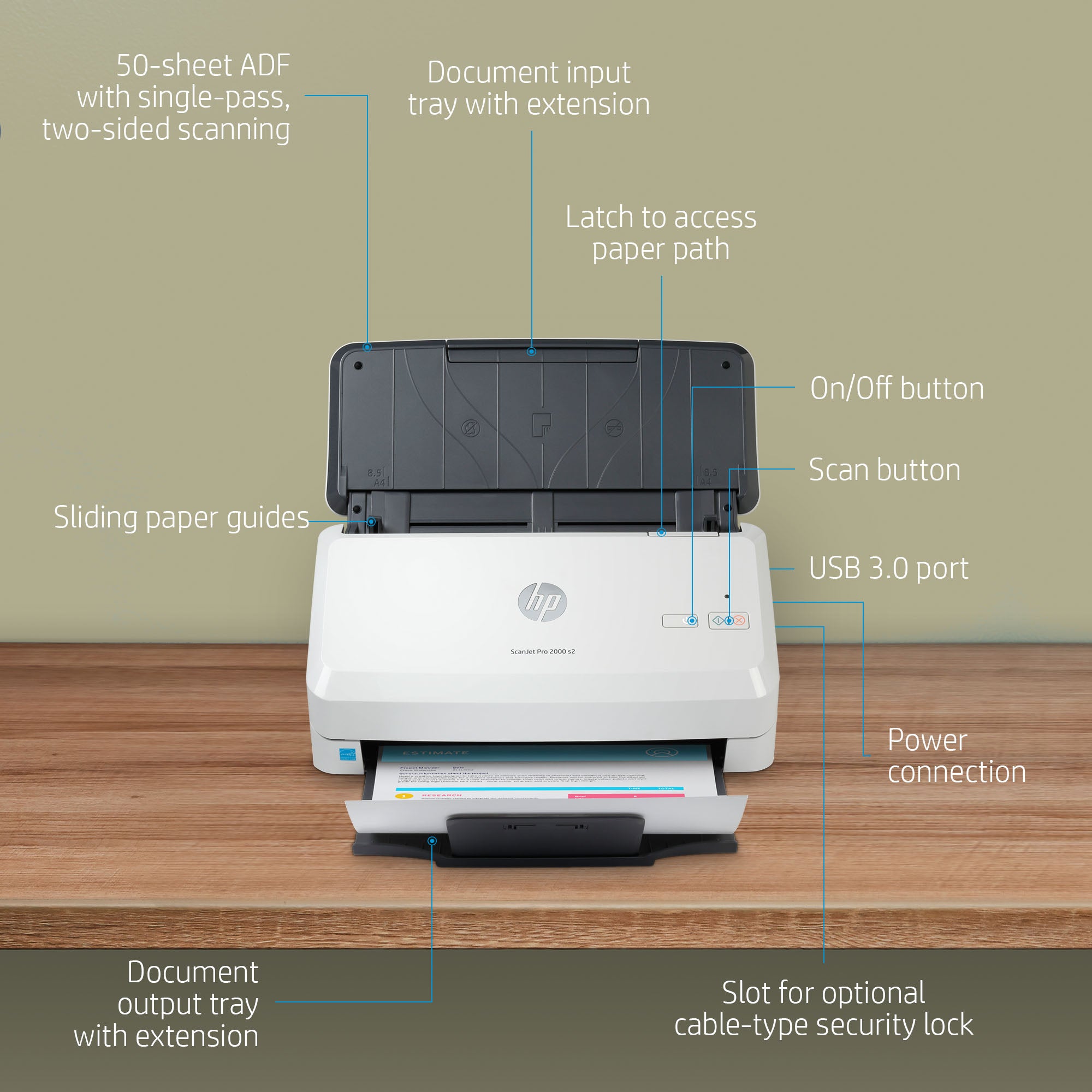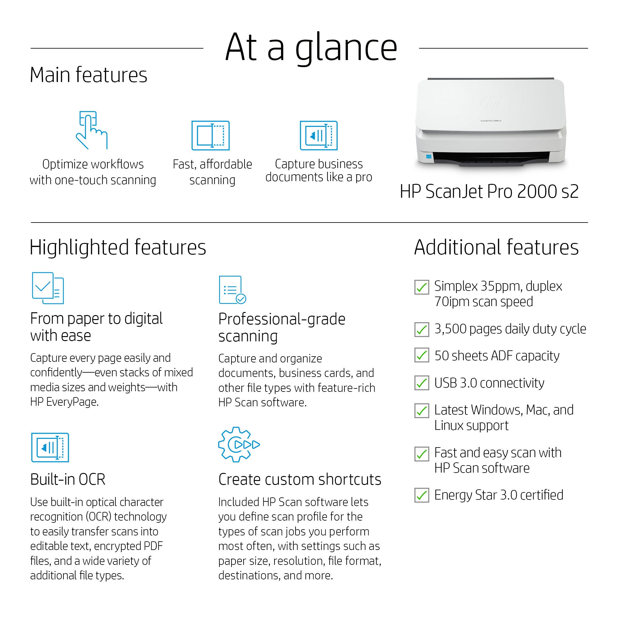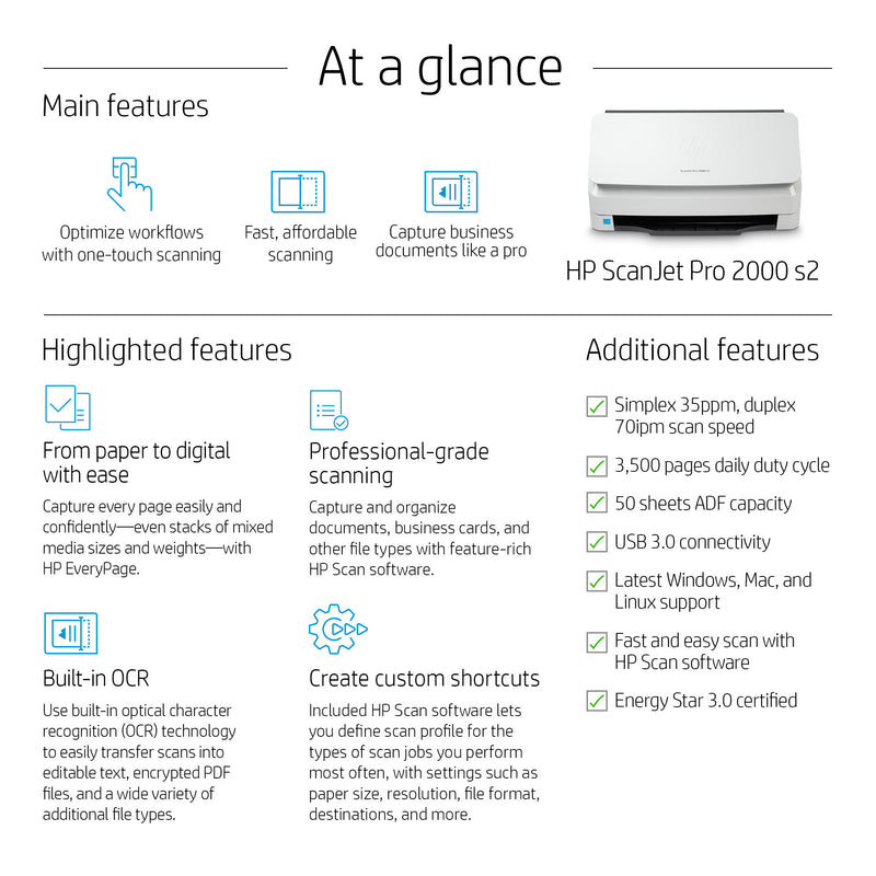 | Box contents | HP ScanJet Pro 2000 s2 Sheet-feed scanner; Power cord; Power adapter; USB cable; Scanner engine; Flyers; Install guide |