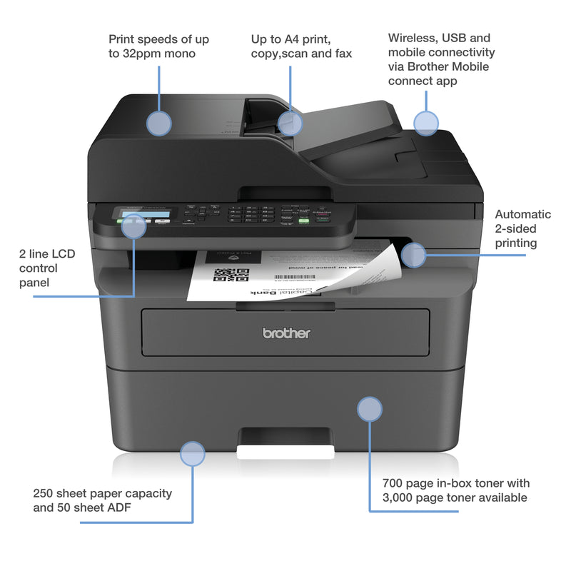 Our range of mono laser printers designed for home and small offices, come equipped with a variety of time-saving features that enable you to improve your output, leaving you with more time to focus on other tasks. Get setup with ease and download the Brother Mobile Connect app, enabling you to print and scan from virtually anywhere.