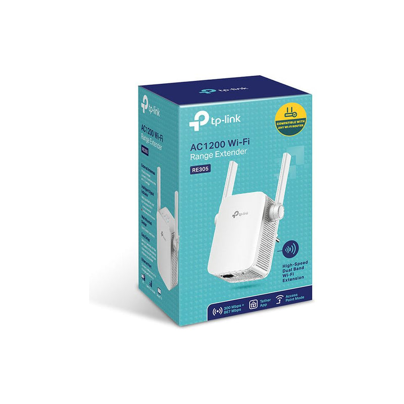TP-Link RE305. Type: Network repeater, Data transfer rate: 867 Mbit/s, Ethernet LAN data rates: 10,100 Mbit/s. Antenna type: Internal, Transmitting power (CE): 17 dBm. Cabling technology: 10/100Base-T(X), Networking standards: IEEE 802.11a, IEEE 802.11ac, IEEE 802.11b, IEEE 802.11g, IEEE 802.11n, IEEE 802.3, IEEE 802.3u, Wi-Fi standards: 802.11a, 802.11b, 802.11g, Wi-Fi 4 (802.11n), Wi-Fi 5 (802.11ac). Product colour: White, Quantity per pack: 1 pc(s). AC input voltage: 100 - 240 V, AC input frequency: 50/60 Hz, Power consumption (max): 7.3 W